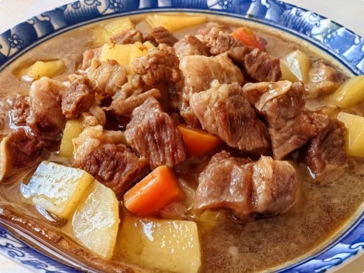 4. Peel and cut potatoes and carrots into chunks. When the beef is nearly tender, add the potatoes and carrots. Simmer for another 15–20 minutes until the vegetables are cooked. If the broth is too thin, uncover and reduce slightly. Taste for seasoning—curry cubes usually contain salt, but add more if needed.
