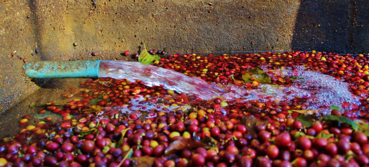 The non-quality fruit from coffee cherries will emerge on the water surface, while the harvestable ones will sink down to the bottom.