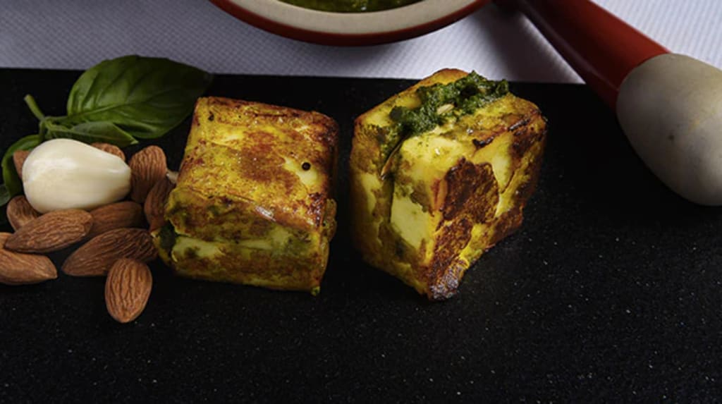 The paneer is then served with an almond pesto sauce, which is made with almonds, garlic, olive oil, and spices. This dish is often served with naan bread or rice.