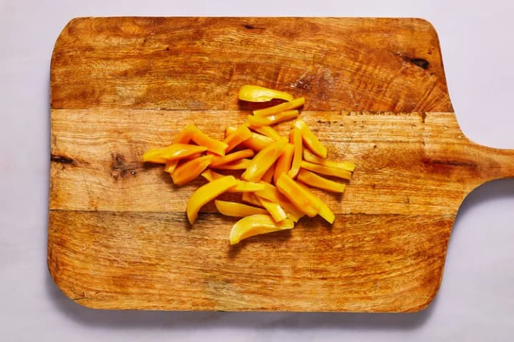 4. If using, drain the jackfruit from the syrup and place 4 pieces on top of a paper towel and pat them dry with another paper towel. Slice the jackfruit into quarter-inch strips.