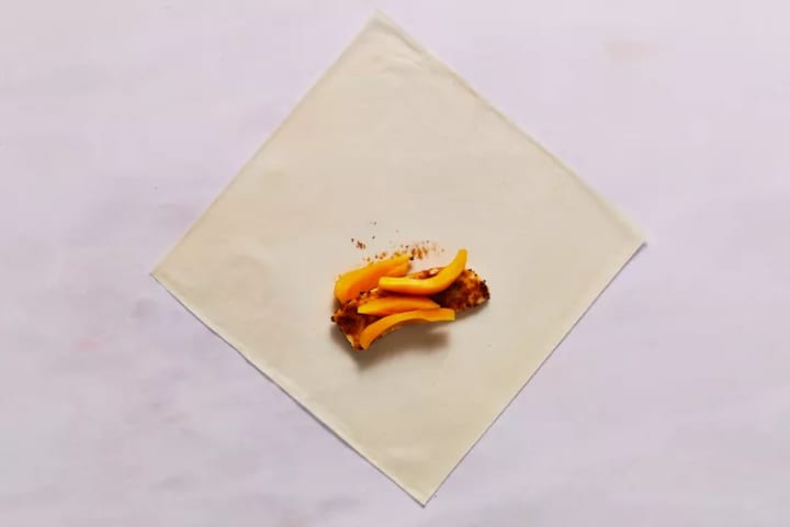 10. Fold the bottom of the wrapper over the fruit and roll upwards once.