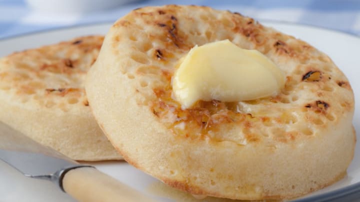 English muffins are small, round, flatbreads that are baked from a soft yeast dough. After the muffins are formed they are baked on a griddle. When ready English muffins are cut in half and toasted then buttered and served for breakfast with sweet or savory toppings.