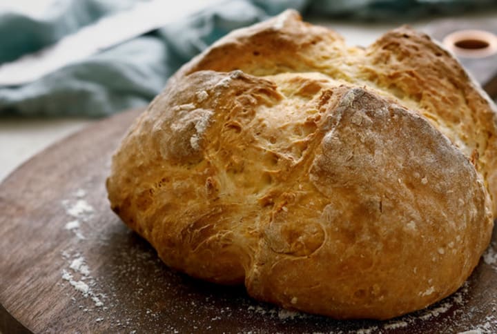 Soda bread is made from only a few ingredients - flour, salt, baking soda, and buttermilk. There are recipes that can include eggs and olive oil. Not much kneading is needed and the bread is shaped into a round cake or flattened and cut into four pieces that are known as farls.
