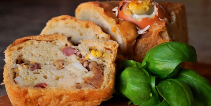 Casatiello is a traditional Italian Easter bread. It is made with leavened dough consisting of lard or olive oil and then filled with meat and cheese then rolled up and baked in a large ring mold. The stuffing consists of pork salami, Italian-style cured meat, and sliced semi-hard cheese.
