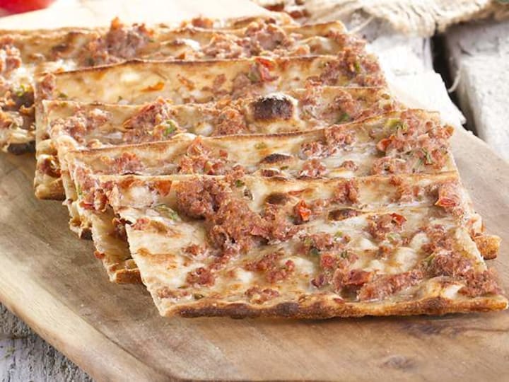 Etli Ekmek is a delicious Turkish pizza-like dish that originated in the city of Konya. The name of the dish translates to bread with meat. It is a thin, flatbread that is prepared with flour, sugar, salt, yeast, and oil. Then topped with ground beef and finely chopped onions, tomatoes, and peppers.