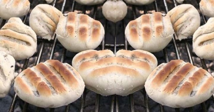Roosterkoek, literally meaning grill cake, is a traditional South African bread baked on a grid over coals. The bread is prepared with flour, yeast, salt, sugar and water. It is then rolled into small balls, brushed with butter, and grilled until slightly charred.