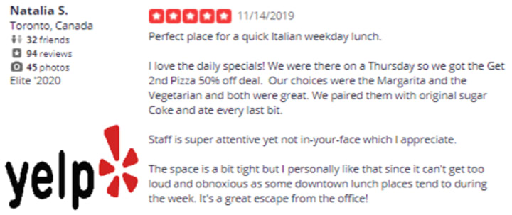 To make this long story short, the pizza they provide has a thin crust with delicious taste and extraordinary quality. They also offer takeout and delivery, making you capable of having your meal at your favorite spot. Besides, they can cater to your events and deal with everything flawlessly. Their fresh and delicious foods served by friendly staff in large portions and reasonable prices create a memorable experience for you