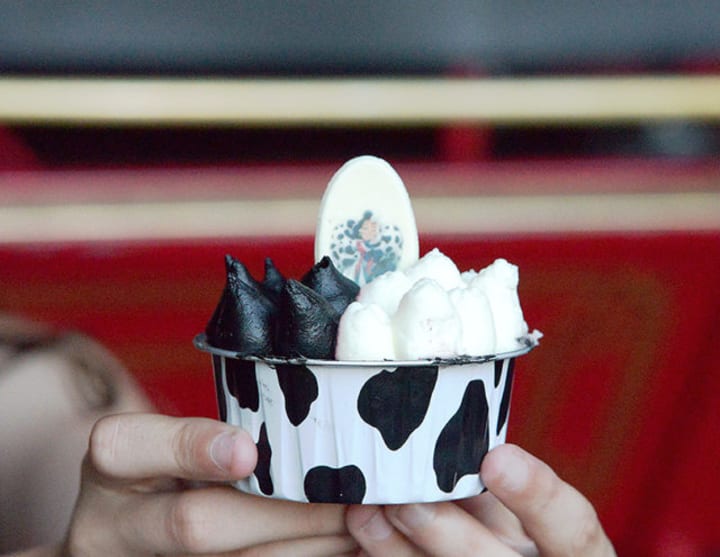 - Cruella de Vil Brownie—brownie with a spotted cup with black dark chocolate mousse, white chocolate mousse, and a Cruella de Vil logo.