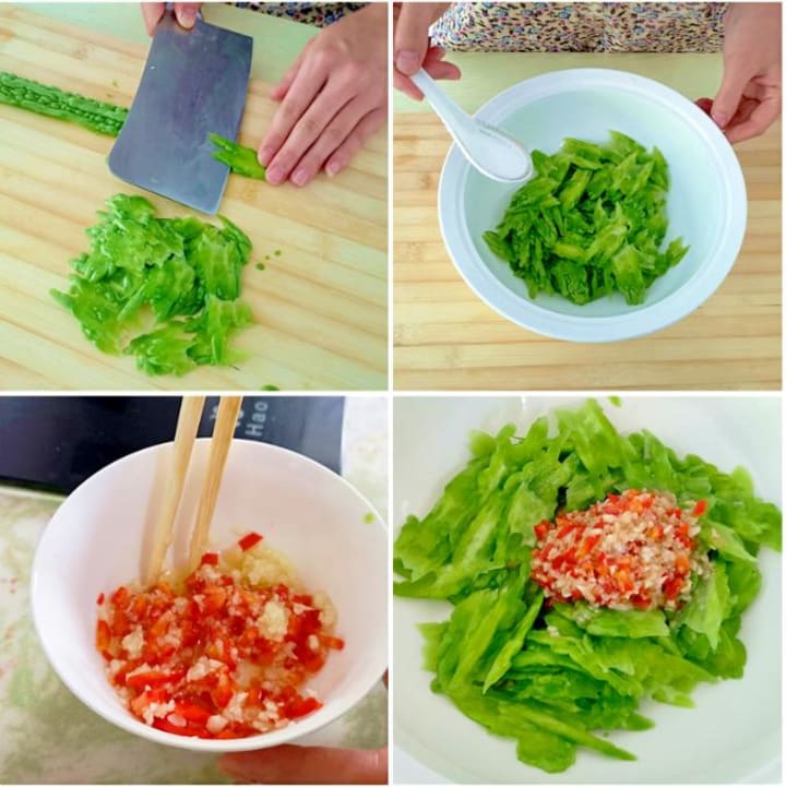 1. Prep: Halve washed bitter melons lengthwise. Scrape out white pith (the primary source of bitterness) with a spoon. Slice thinly at an angle.