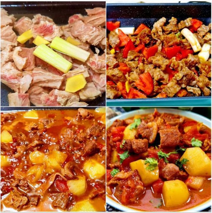 1. Blanch 500g cubed beef brisket in cold water with ginger and cooking wine. Skim off foam.