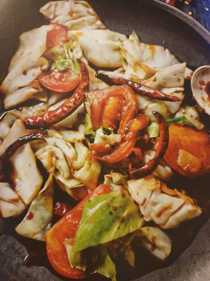 The first difficulty with this one was the ingredient list. It asked for a “sweetheart cabbage” dried red chillies, “Chinkiang black rice vinegar” and rice wine. We went to our local Asda’s and whilst in the shop, realised how completely out of our depth we were. In the world foods section we found a rice vinegar but it was light in colour not dark, would this suffice? We had no clue. There was no rice wine to be seen or anything that looked like a “sweetheart” cabbage. Google was definitely our friend, standing next to the Asian section of the aisle frantically typing substitutes for rice wine “dry white wine will work as a substitute to rice wine”. Phew! So we collected a normal cabbage, hoping this was sweetheart enough, opted for the light version of the rice vinegar and headed on our way to the alcohol section. We also substituted the full dried chillies for chilli flakes. It was going well.