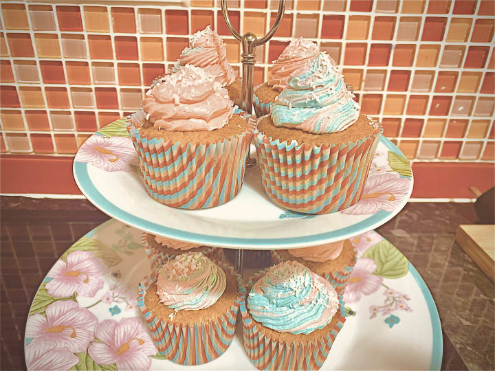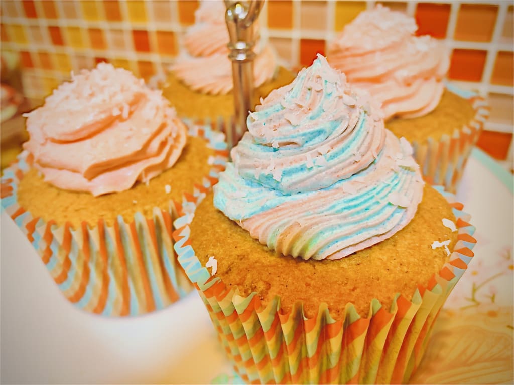 - Get the piping bag and a spatula. Fill one side of the piping bag with blue and the other with the pinkish red - you should have some pinkish red left over - and decorate four to six of your cupcakes.