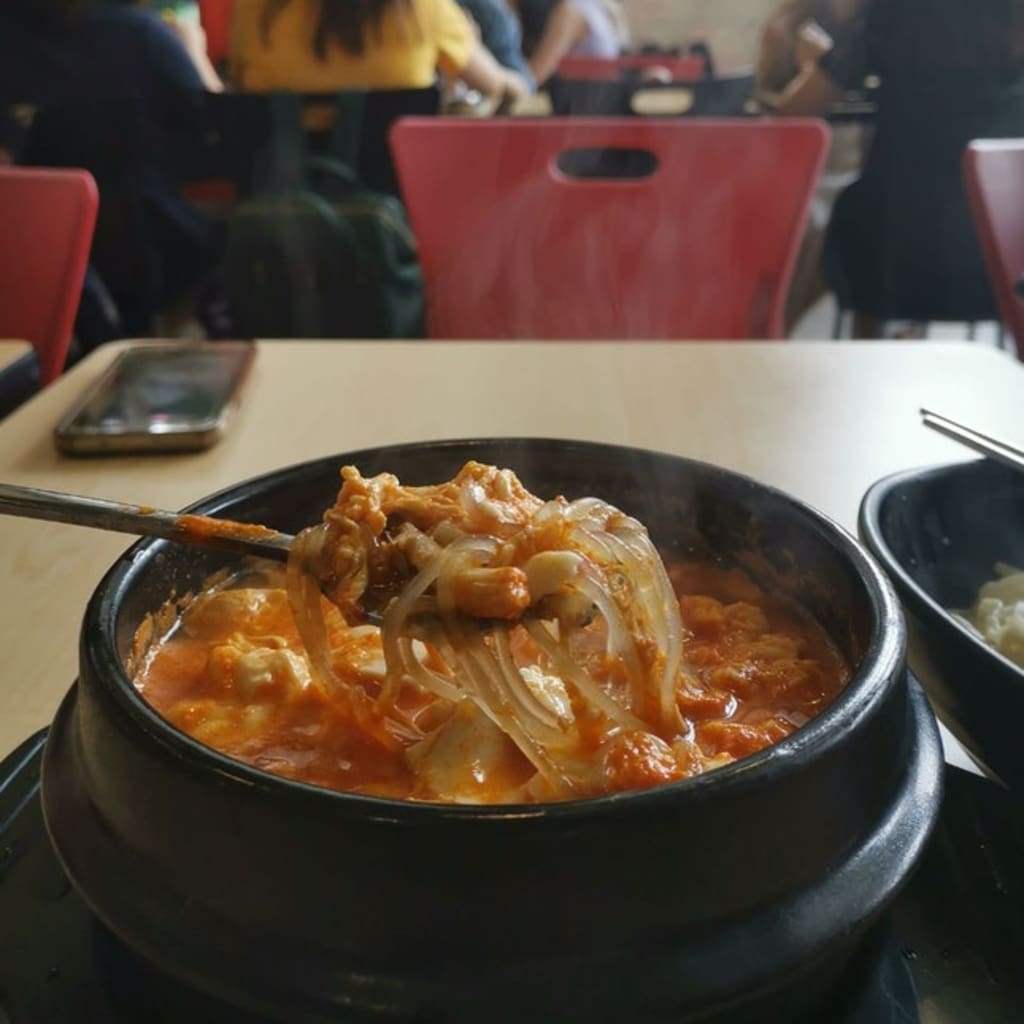 Of course it didn't help that the first face I saw as I stepped my bilk over the door frame was a slightly stooped older woman who could have been made in the Korean auntie factory. She struggled to greet me in English and I saw a softening of her face when I tried to speak in my poor Korean. As I tell my students, I can order food and beer in five languages but I am far from fluent. I wish my language skills were as developed as my cultural and cilinary appreciation. I asked for Kimchee Jiggae with seafood and soft tofu. Some dimplings and a clear noodle dish that has always tickled my tastebuds as a first course. As I sipped a lemonade a tray arrived loaded with small dishes and a wide range of side dishes. There my language skills failed because I knew the word for side dishes but not how to ask if each dish would be refilled for free or at a cost. Luckily the auntie had enough English to assure me that I could get as many refills as I needed. She laughed and brought over a dish of fried dumplings, saying "Serbice" as she placed it in front of me with a fork. By which she meant service which she means customer service and also translates to free stuff in lieu of friendly and efficient service of your food. The friendliness and efficiency are just part of the people and I believe they don't understand the idea of adding these things to your behaviour, therefore service means adding free stuff.