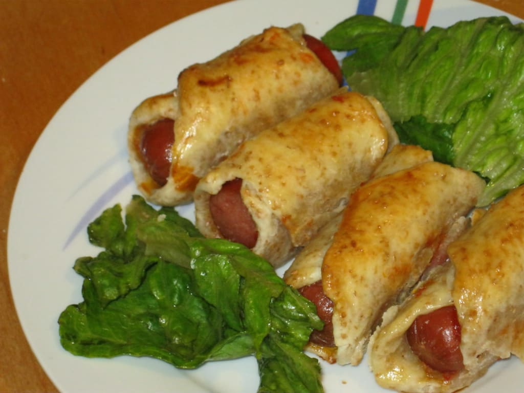 Préchauffer le four a 350 degrés. Découper la pâte en 24 petites boules plus ou moins proportionnelles. Garnir chaque de ketchup au centre, d’un morceau d’ hot-dog et refermer. Disposer le tout dans un plat allant au four et badigeonner le dessus avec l’œuf battu. Cuire 30-35 min ou jusqu'à ce que la croûte soit dorée. Servir avec une salade!