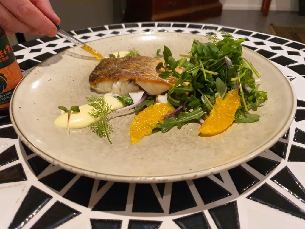 Crispy skinned barramundi, lions mane infused cauliflower puree with citrus salad