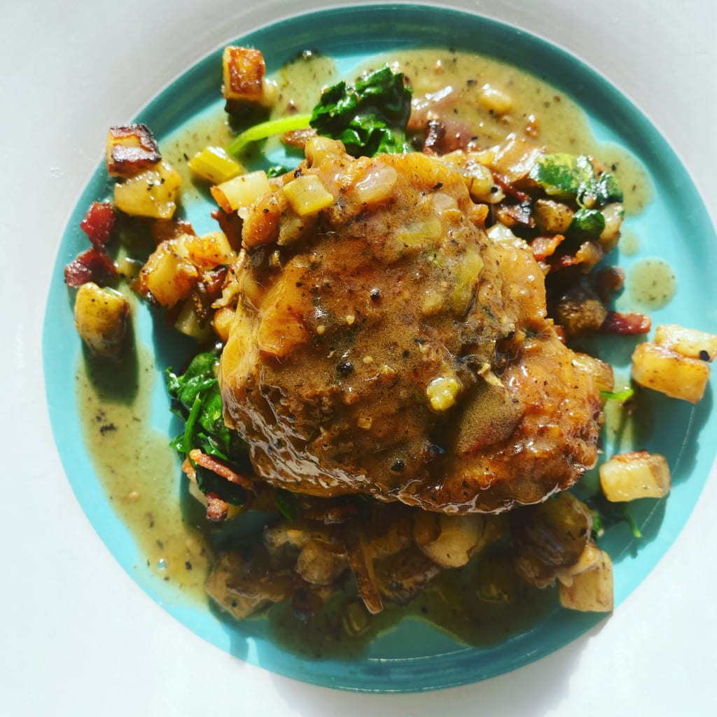 My blog allows me to express my love for food and cooking, while educating people on techniques and terms. The photo above is one of my very own recipes for Roasted Chicken ontop of a Potato Bacon Spinach Hash and a delicious pan sauce. I come up with recipes in my free time and perfect them until they're ready to share. Without having to be hindered from jobs where I’m making other people’s dream dishes, I can come home, create, and express my own love for food through my food blog. This gives me a chance to share my deep love for and my knowledge to other people.