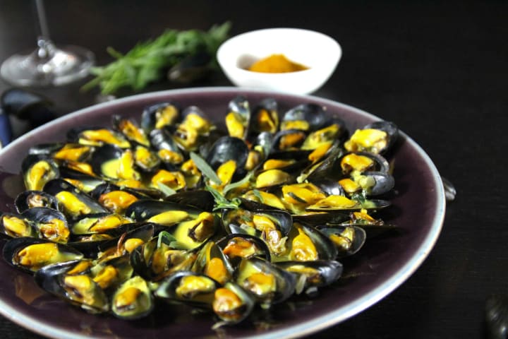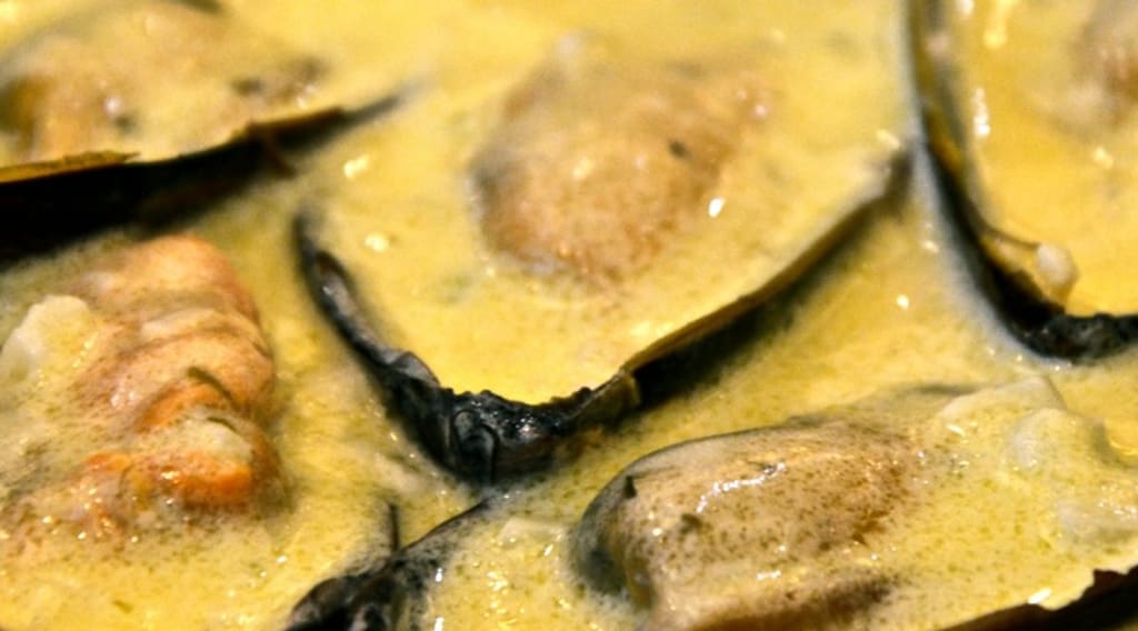 Mouclade is a traditional dish that originated in La Rochelle in the southwest of France. To make this dish mussels are cooked in cream, and white wine, and flavored with saffron and some curry spice. This dish is served with a crusty baguette to soak up the sauce.