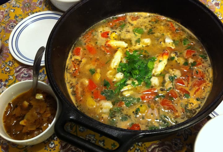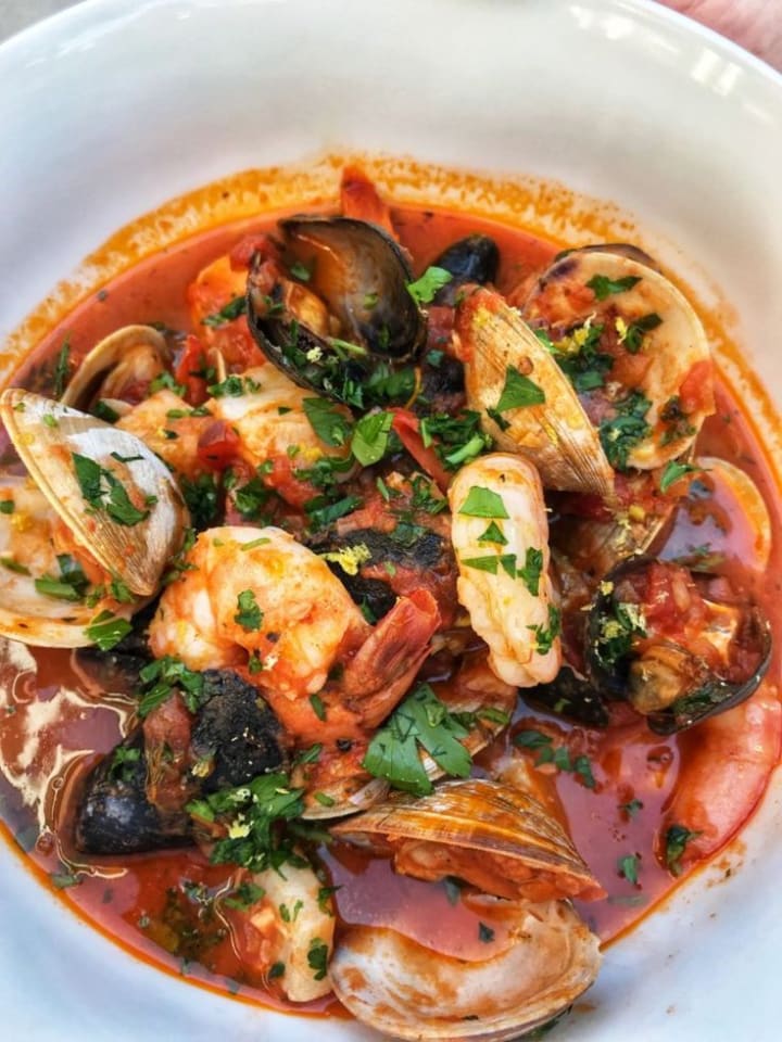 Cacciucco is a Tuscan fish stew and traditionally has five different kinds of fish and seafood, one for each “C” in the name. Seafood includes octopus and squid or cuttlefish which are first placed in the stew then toward the end of cooking tender-flesh fish, mussels, and prawns are added.