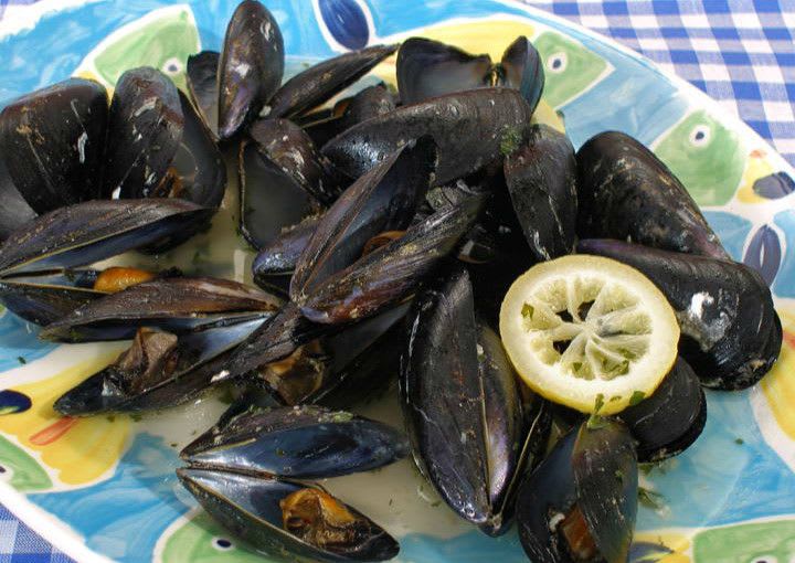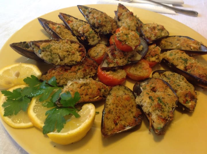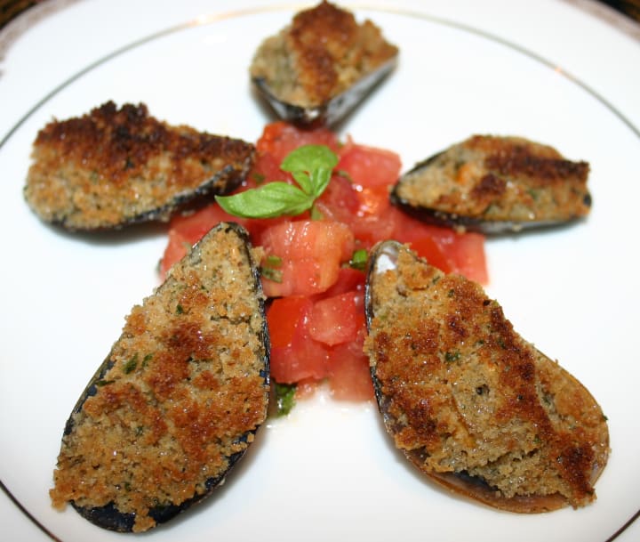 Cozze gratinate is a traditional mussel dish. It is a combination of mussels, garlic, breadcrumbs, parsley, and olive oil, and seasoned with oregano, salt, and pepper. The mussels are steamed until they open. Then half-shells with mussels are placed into a roasting pan, sprinkled with parsley, oregano, and garlic. They are drizzled with oil, sprinkled with breadcrumbs and baked for a few minutes, and sprinkled with black pepper.