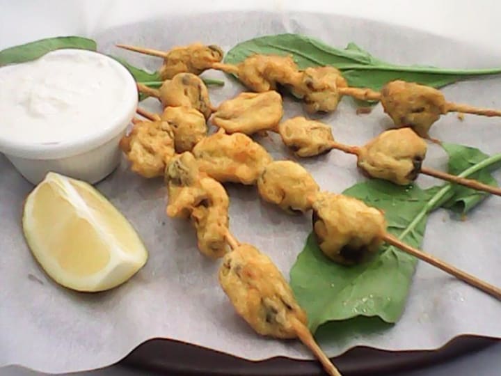 Midye tava is a Turkish street food that is also served as an appetizer or snack. De-shelled mussels are covered with batter and deep-fried in a metal cauldron until crispy. They are then stuck on a stick and served with a dash of salt and a side of tangy tarator sauce for dipping.