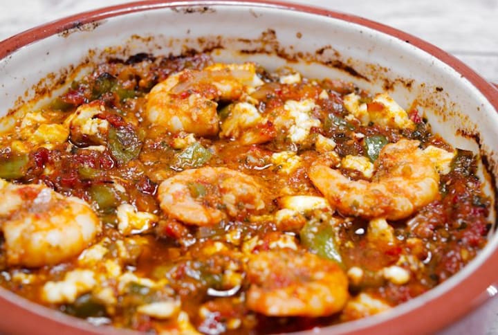 Garides saganaki is a classic dish that is made with shrimp. Sautéed shrimp are deglazed with anise-flavored ouzo, doused in tomato sauce, and topped with crumbled feta cheese. It is served as an appetizer or a mezze dish accompanied by warm pita triangles or bread.