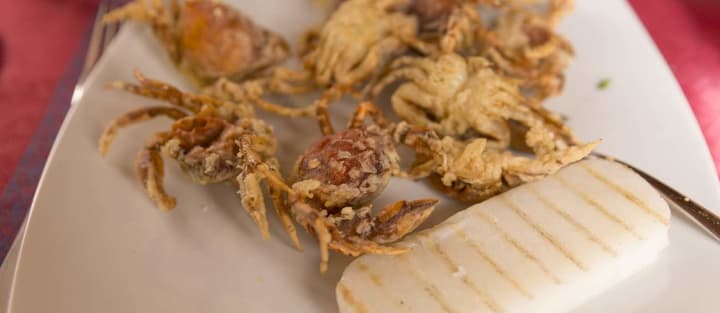 Poo cha or poo ja is a Thai dish with stuffed, deep-fried crabs. Fresh crabs are steamed and the meat is removed and flaked. The flaked crab is combined with pork, shrimp, soy sauce, garlic, fish sauce, and different spices. The mixture is stuffed in crab shells and sometimes steamed before being deep-fried.