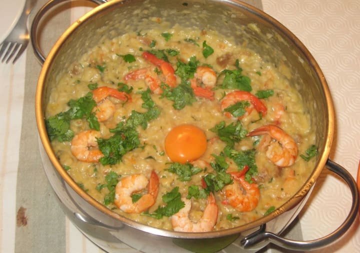 Acorda de camarao is a flavorable seafood broth. It is made with cooked shrimp, bread, sautéed onions, and olive oil. It turns into a creamy mash that is thickened with eggs and seasoned with cilantro. The soup is garnished with shelled shrimp.