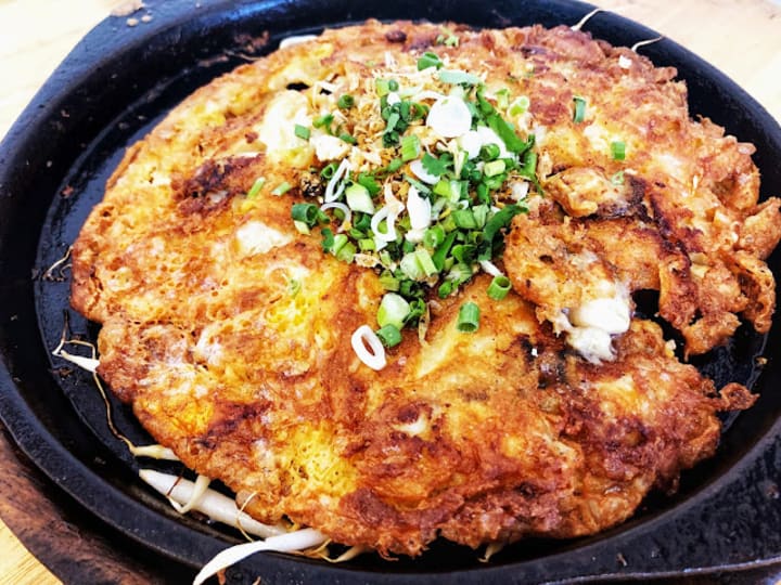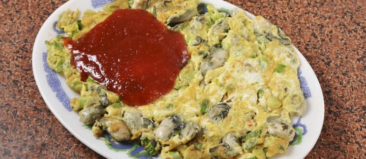 Oyster omelets originated in Chaozhou Teochew in the Fujian region. It has become the signature dish of the Hokkein people. The dish is made with small oysters, added to the egg batter, and potato starch.