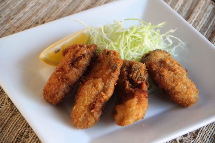 Kaki Fry includes Japanese deep-fried oysters. Shucked oysters are dusted with flour, dipped in beaten eggs, and coated in panko breadcrumbs. Then they are deep-fried until they are golden and crisp. When ready they are served with lemon wedges, fresh vegetables, and different sauces and condiments.