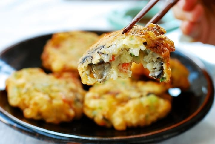 Guljeon originated in South Korea and is made with oysters. The oysters are shelled and rinsed. They are coated in flour and dipped in a mixture of beaten eggs, rice wine, salt, pepper, and scallions. Then they are pan-fried in hot oil and served hot with dipping sauce.