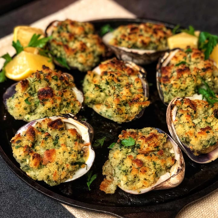 Clams oreganata is an Italian-American dish. It is prepared with six or twelve littleneck clams, butter, breadcrumbs, oregano, parsley, garlic, lemon zest, and white wine. The clams in half shells are topped with a mixture of all of the ingredients and baked.