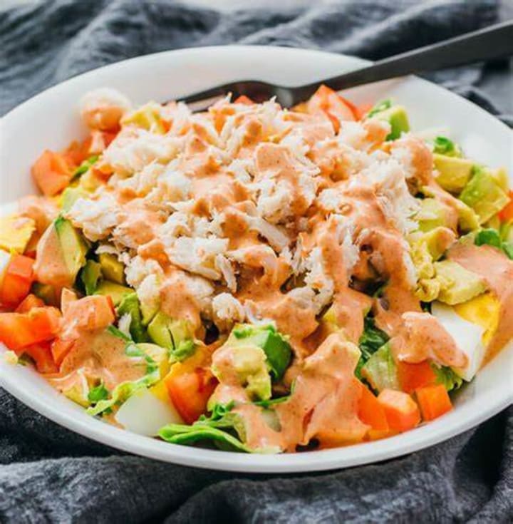Crab Louie is an American salad originating in San Francisco, California, The salad is prepared with Dungeness crab meat, tomatoes, iceberg lettuce, asparagus, hard-boiled eggs, and Louie dressing. The dressing is made with chili sauce and mayonnaise. Optional ingredients include white olives, and green onions.