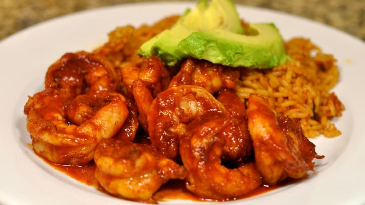 Camarones a la diabla is a traditional Mexican dish. The dish is a combination of shrimp, tomatoes, garlic, onions, arbol chili peppers, olive oil, and salt. The shrimp are cooked in olive oil until pink. The hot peppers are combined with the other ingredients and then the sauce is poured over the shrimp. Once the dish has simmered and the sauce is bubbling it is served right away. It is accompanied by warm corn tortillas or crusty bread.
