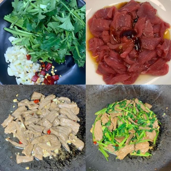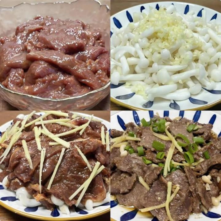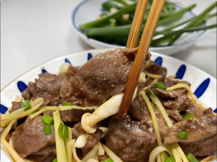 3. Aromatics: Sauté garlic and ginger in hot oil until fragrant, then scatter over beef.