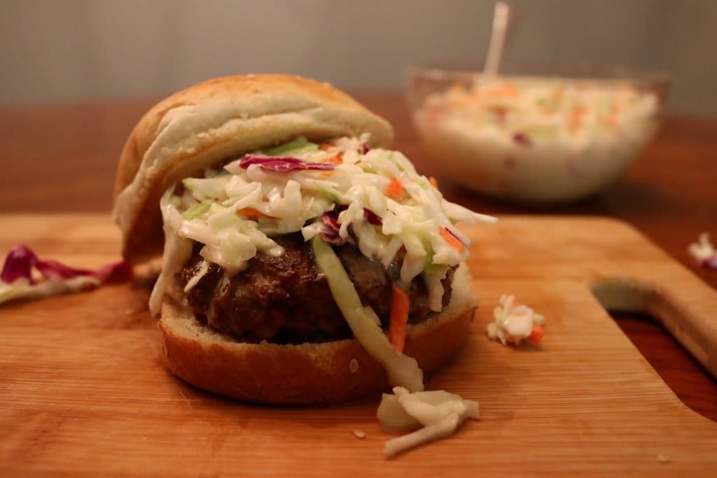 - Put a burger on a bun and then add about 5 tablespoons of coleslaw on top and enjoy!
