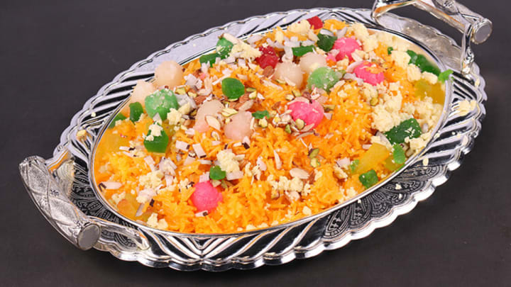 Zarda is a fragrant and sweet rice dish from Pakistan that is cooked using basmati rice, milk, and sugar. The meal's golden hue is achieved by cooking the rice with a combination of traditional spices, most frequently cardamom, cinnamon, and saffron. Frequently included are raisins and chopped, roasted nuts like pistachios, almonds, or walnuts.