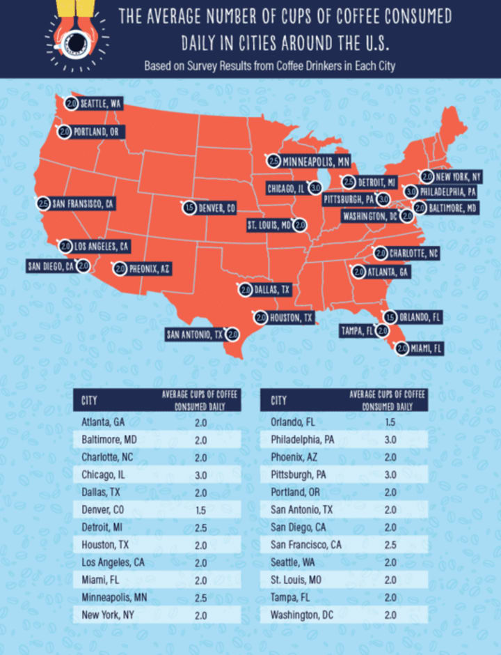 In addition to the overall rankings, SimpleTexting found how many cups of coffee people in each city drink per day on average. Philadelphia, Pittsburgh, and Chicago residents all drink an average of three cups per day. That’s nearly 300mg of caffeine per day on average, so it’s probably safe to assume that their tolerance is high and the number of hours of sleep they get a night is low.