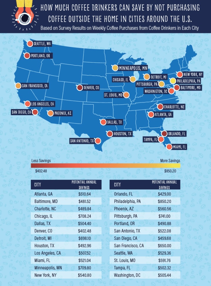 Coffee isn’t free, and if you buy your own cup of coffee every day, it can get costly. The analysis found that Philadelphians are spending the most on coffee based on how often survey respondents said they buy coffee each week outside of the home and the average price. In a whole year, somebody in Philadelphia could spend over $850 on coffee. Think about how much money somebody could save by making coffee at home just once more every week. When put into this perspective, going to Starbucks or Dunkin Donuts can definitely cause some second-guessing.