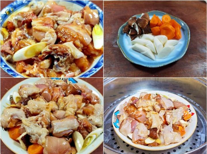 3. In a deep dish, layer carrot/yam at the bottom, then add chicken and mushrooms. Drizzle with mushroom-soaking water for extra aroma.