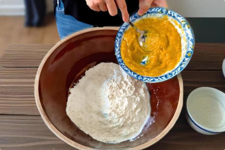 2. In a large bowl, add about 400g of all-purpose flour and a small teaspoon of salt (to enhance elasticity). Slowly pour the warm pumpkin puree into the flour while stirring with chopsticks. Once it forms large, snowflake-like clumps, knead by hand. If the dough feels too dry, add cold water in small amounts (about 30-50ml total) until a smooth, soft, non-sticky dough forms. The dough should be slightly soft for the best texture. Cover with a damp cloth or plastic wrap and let it rest for at least 30 minutes. The rested dough will become very elastic and smooth.