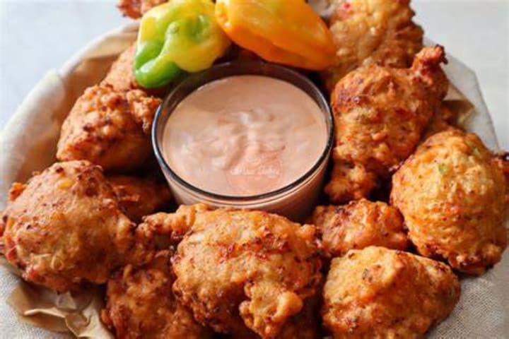 Conch fritters are a delicacy of Caribbean and Creole cuisine. It is the national dish of the Bahamas. The dish consists of pounded, tenderized conch meat mixed with tomatoes, onions, celery, bell peppers, and peppery seasonings. Then the mixture is formed into balls and fried in hot oil.