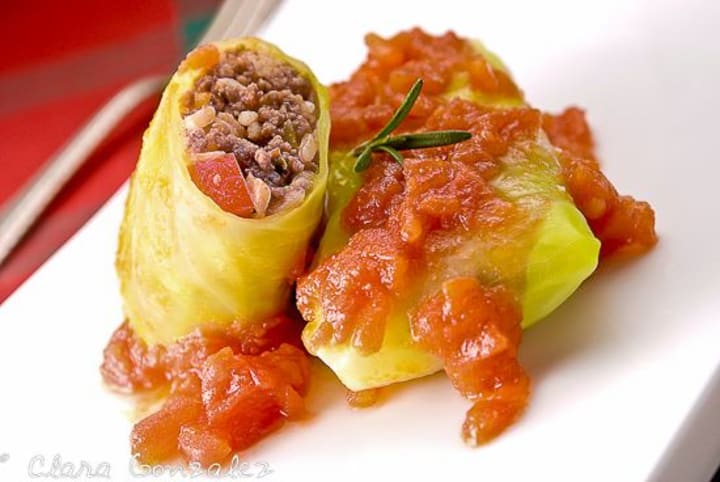 Ninos envueltos literally translates to wrapped children. It is a traditional dish that is made with rice and ground beef wrapped in cabbage leaves and cooked in tomato sauce. The dish is flavored with garlic, basil, bell peppers, and onions. The tomato sauce consists of olive oil, tomatoes, garlic, oregano, sugar, salt and pepper. The cabbage rolls are simmered in the tomato sauce until tender and fully cooked.