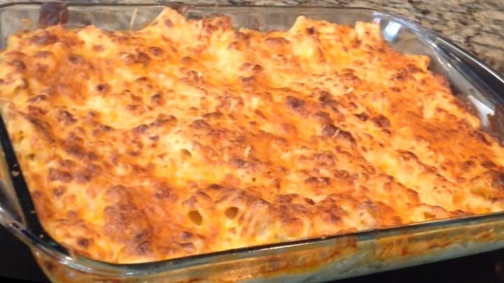 Makawoni au gratin is prepared with larger types of pasta like rigatoni and penne. The dish is seasoned with mayonnaise, Worcestershire sauce, mustard, and white pepper. The pasta along with all the other ingredients is placed in a baking dish and sprinkled with grated cheese like cheddar or Parmesan and baked until the top is golden and the cheese melted. Additional ingredients can be added like ham or shredded chicken.