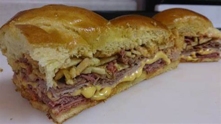 Pan con bistec is a traditional Cuban sandwich. It is made with toasted Cuban or French bread topped with sliced beef steak, grilled onions, tomatoes, potato sticks, and lettuce. Mayonnaise and ketchup can be used in the sandwich.