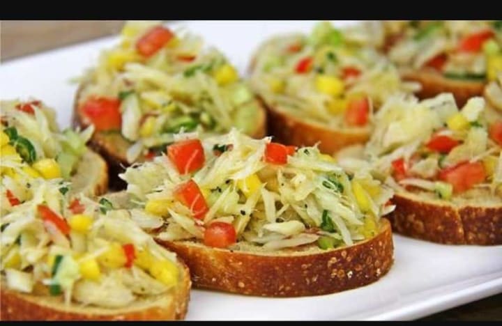 Saltfish buljol is a spicy dish prepared by soaking and boiling salted fish pieces and mixing the fish with tomatoes, hot peppers, sweet peppers, onions, and oil. It is usually served for breakfast spooned into a bread called bake, making it into an open-faced sandwich.
