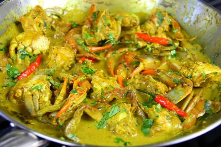 Curried crab and dumplings is a traditional dish. The crabs are cleaned and soaked in lime water and then drained. They are seasoned with celery, pimento peppers, onions, garlic, and chives. Once marinated the crabs are placed in a pot with curry powder paste, coconut milk, and hot peppers. The dumplings are prepared with flour, grated cassava, sugar, salt, and water then added to the pot with the crab and simmered until the sauce thickens.
