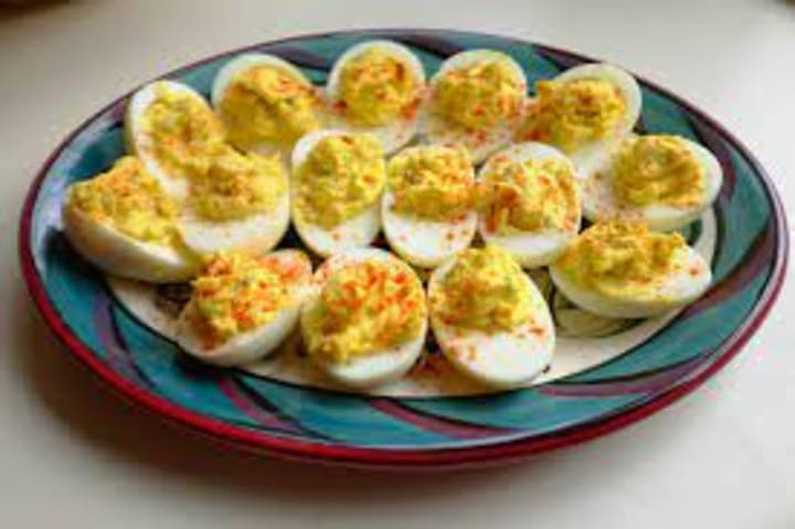 Most people like deviled eggs. Stop thinking they are just for picnics and appetizers. Top deviled eggs like baked potatoes. Use hard-boiled halved egg whites with the egg yolk and healthy ingredients such as cheese, olives, and green onions. Bacon, tuna, or salmon can also be added. A couple of eggs per person should be enough for a hearty and healthy meal when served with fresh fruit slices and a dinner roll or crackers.
