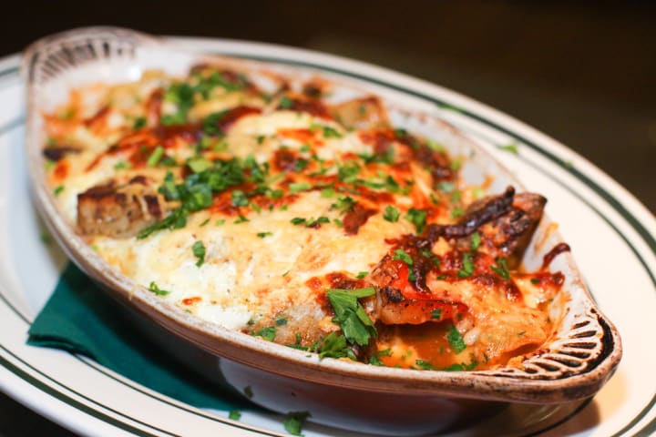 Make a healthy Italian meal with eggs. Layer your favorite tomato sauce, Italian cheeses, and eggs. Bake about 20 minutes until cheese is bubbly and the egg yolk is thoroughly cooked, but not hard. Serve with a green salad and garlic bread.