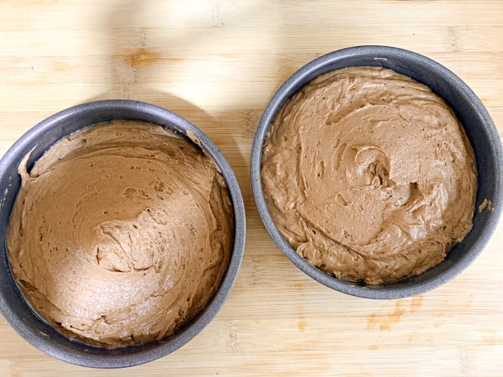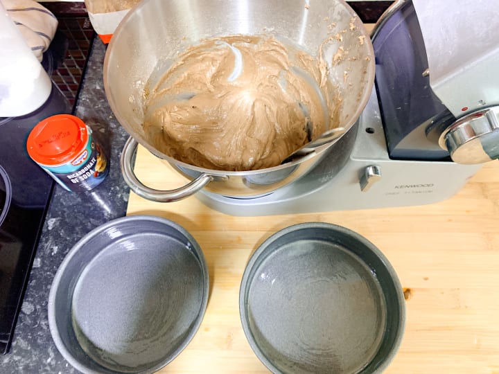 - Split between two cake tins and bake in the oven for half an hour