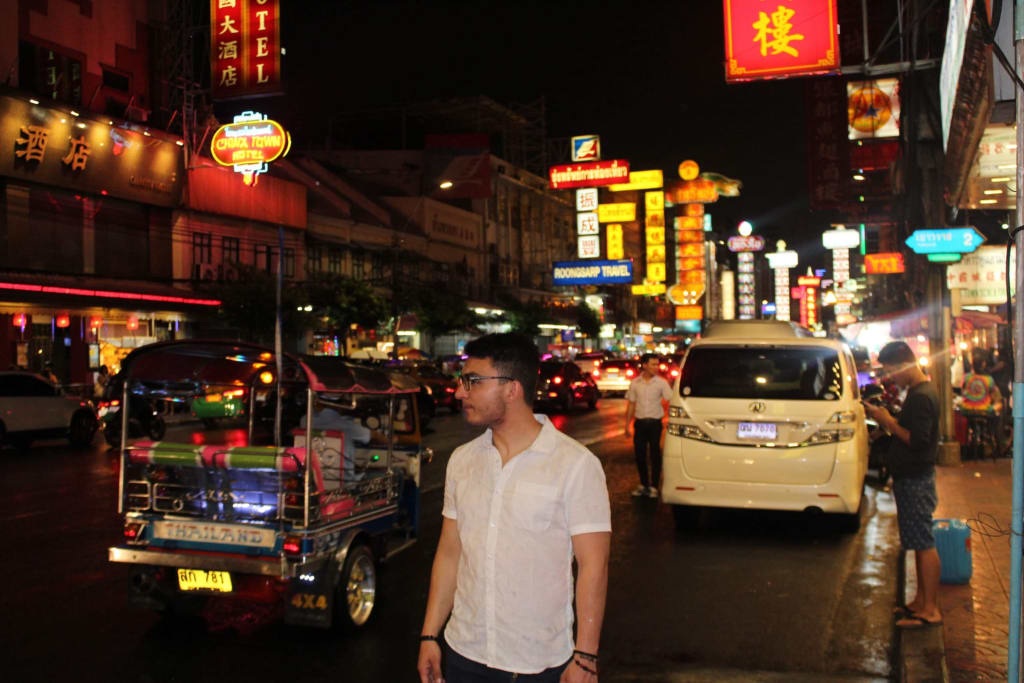 We ask around and decide to visit Chinatown to get some food. I was a bit confused at there being a Chinatown in Bangkok, but we were intrigued so we went. The drive there blew my mind, it was a different city at night. Apparently Bangkok discovered that by lighting up the streets with colourful xmas lights all year long the city didn't have to worry about the littering or maintenance, because my eyes were only fixated on the pretty lights everywhere. The cool breeze was a blessing, and the driver's stories made the ride a wonderful experience.
